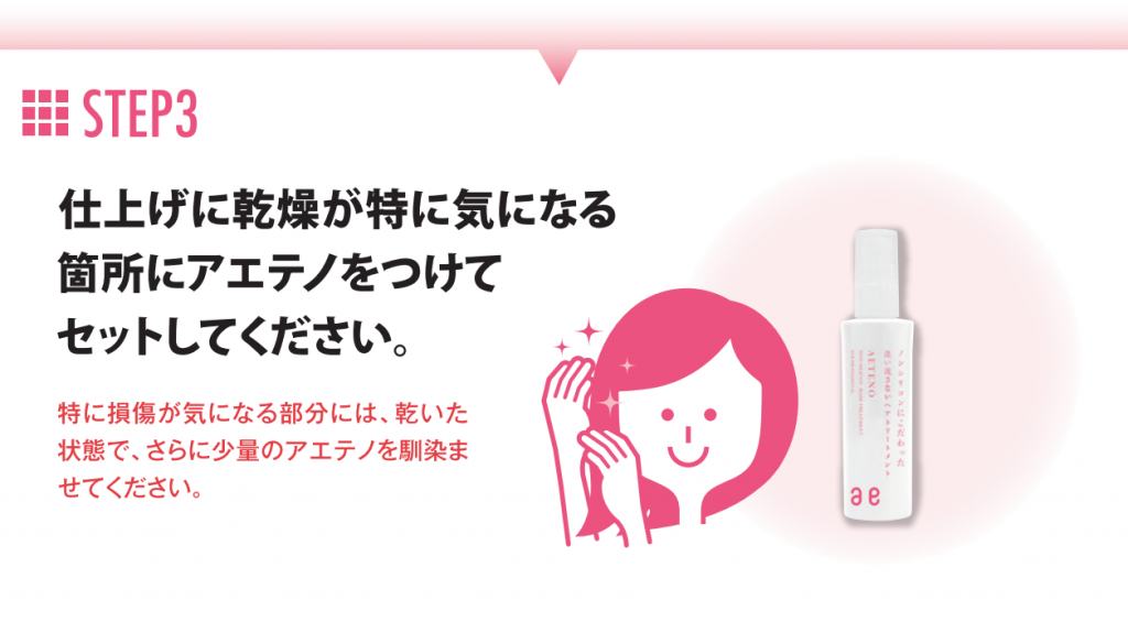 アルマダスタイルのアウトバストリートメント「アエテノ」はM3・5とは違い、髪本来を美しくするものではありません。M3・5で髪のコンディションが最適な状態になるまでに、少しだけ毎日のヘアケアのお手伝いをするものです。他のアウトバストリートメントと違い、シリコンで髪をコーティングすることなく保湿し、髪のごわつきや引っかかりを軽減し、切れ毛や枝毛をなくしていきます。